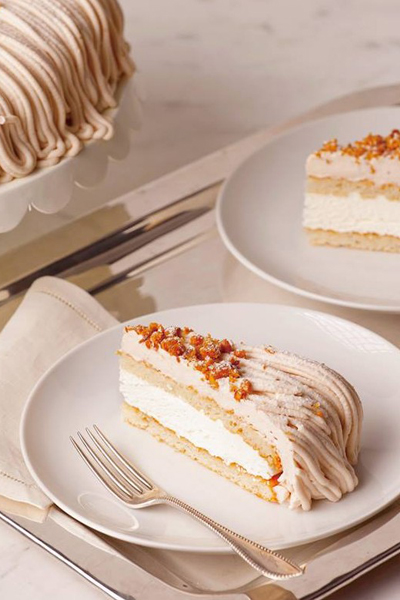 排隊名店Lady M在初秋則是推出栗子奶油蛋糕,濃郁的栗子泥鮮奶油豪邁包覆著達克瓦茲,蛋糕中夾著滑順的乳白色鮮奶油,表層似蒙布朗的交錯裝飾是主廚的得意之作。最後撒上酥脆的核桃仁及糖霜,將栗子的香醇甜蜜發揮到極致!栗子奶油蛋糕在台北、台中分店皆有販售,台中分店為九月限定販售。