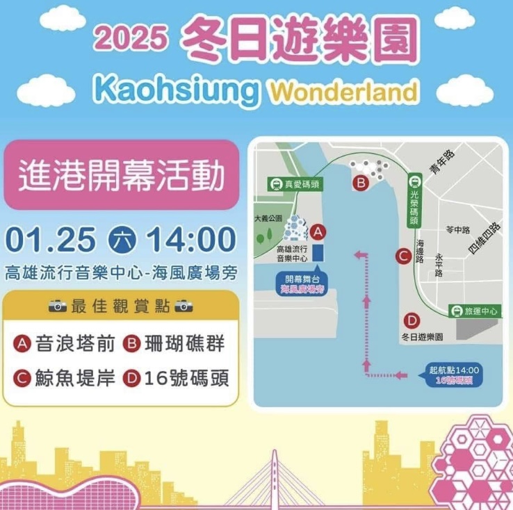 詳細商品及入場資訊近日會再公開,進港動線可觀看可愛吉伊卡哇的海上模樣,高雄市政府觀光局「高雄旅遊網」官網及臉書粉絲團會公布、直播最新動態。
