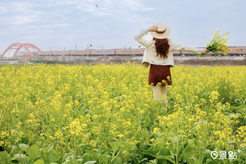 金黃油菜花同框火車紅橋場景這裡拍!位於彰化花壇的油菜花田,不僅能賞冬季限定金黃美景,還能將紅橋及鐵道火車一同收入鏡頭,推薦花海控和攝影迷將這裡加入待訪清單!