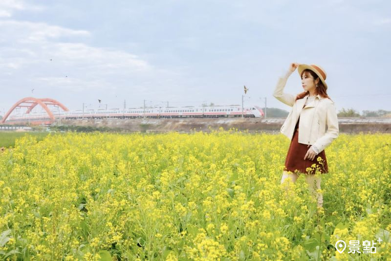 這裡不僅能取景大片金黃油菜花田,還能將紅橋及火車鐵道一同入鏡,天氣好時還能同框藍天白雲,捕捉宛如油畫般的夢幻場景。
