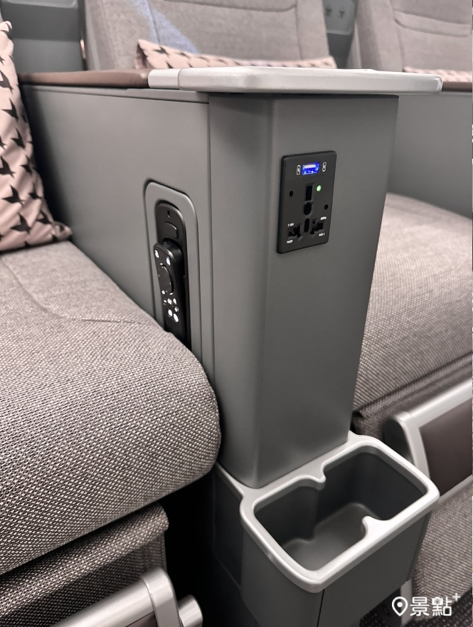 專屬水瓶架則提供旅客置放航程中隨時所需補充的水分。靠走道座椅扶手設有輪椅無障礙功能,讓空服員協助有需要的旅客使用。