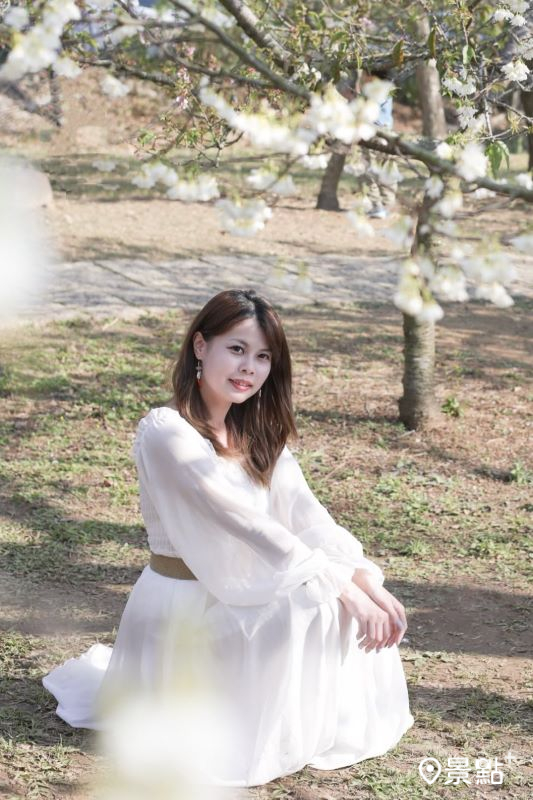 滯洪池兩旁也可賞粉紅櫻花景,站在圍欄旁還能捕捉近距離花景美照,粉嫩的花色搭配藍天白雲和草地,可以輕鬆拍出宛如日劇的場景。待櫻花季結束後,緊接著四月輪到雪白流蘇花開,讓園區成為踏青賞花的好去處。