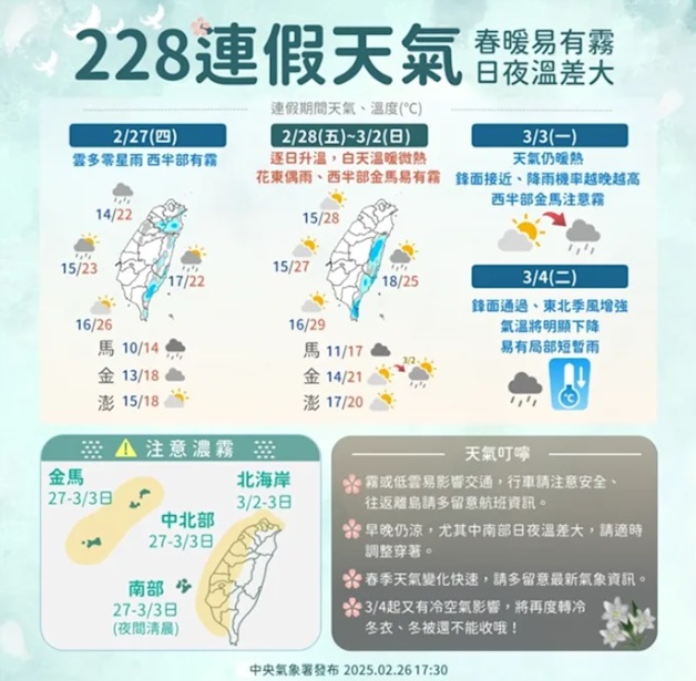 2月28日起環境轉乾,各地為多雲到晴,僅花東地區及恆春半島有零星短暫陣雨,夜晚清晨各地低溫約14至18度,白天高溫各地約23至25度,南部局部地區可以來到27、28度,相較於2月27日更為溫暖;澎湖全天16至20度、金門14至20度、馬祖11至15度。228連假天氣普遍不錯,要小心夜晚降溫溫差大,要到下週一晚起鋒面南下、東北季風增強,逐漸變天。