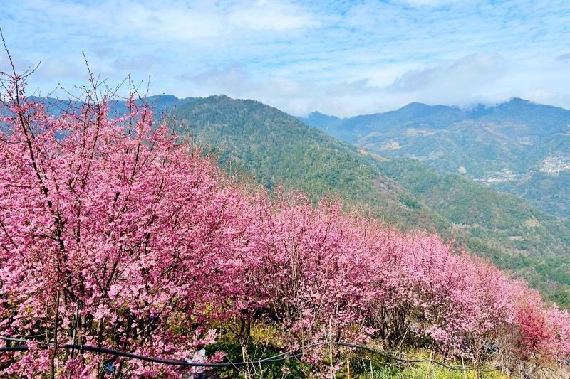 除了雙色花海外,推薦花海控可倚靠在觀景台扶手旁、抬頭看向櫻花,並讓拍攝者在下方取景美照,或是抓拍漫步在櫻花步道的畫面,也可以將櫻花及山景一同入鏡。