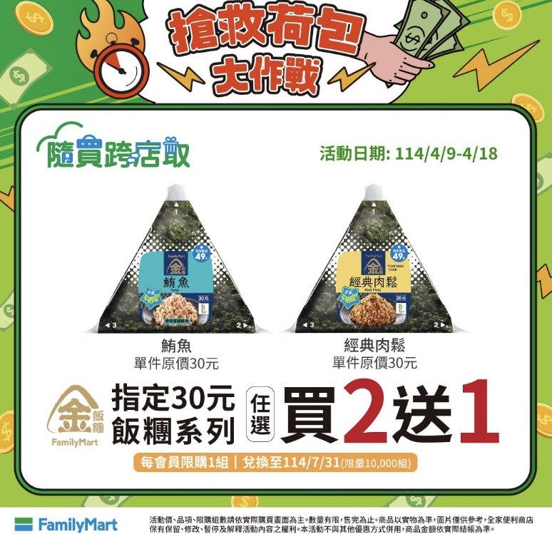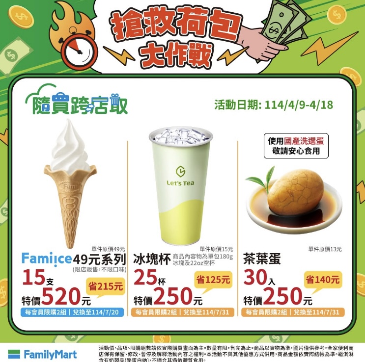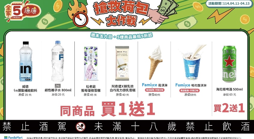 週末優惠追起來,「全家」4月11日至4月13日周末五六日推出「康康五」活動,多樣人氣商品買1送1,包括Fami!ce霜淇淋、喝的霜淇淋,還有阿奇儂x鮮乳坊白巧克力戀乳雪糕、杜老爺藍莓優格雪糕、威德in運動補給飲料、FamiCollection鹼性離子水(800ml)等,週末放鬆也要追優惠!