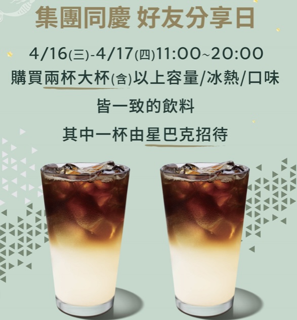 星巴克買一送一好友分享優惠這次不在週一,除了4月15日週二foodpanda外送優惠有星巴克好友分享日,星巴克還推出兩天的統一集團同慶優惠,4月16日、17日(週三、周四)兩天有買一送一的優惠,本週星巴克咖啡優惠記得享用!