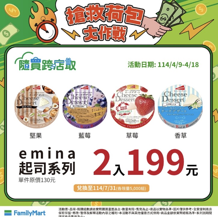 明星商品Fami!ce霜淇淋則有15支520元優惠價,現省215元;補元氣必備的茶葉蛋則推出30顆250元超值價,單顆平均價更不到9元;金飯糰30元系列買2送1、指定麵包商品2件69折;emina起司系列享2入199元優惠,即刻守護全民荷包!