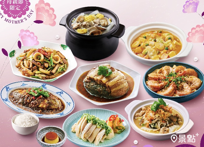 「饗賓集團」合菜品牌也紛紛推出母親節外帶套餐,「真珠 台灣佳味」九品套餐售價3,888元,吃得到〈蔥油鹽焗雞〉、〈蒜蓉鮮蝦粄條〉、〈化口梅干肉〉、〈蔭樹子蒸扁鱈〉、〈真珠小炒〉、〈金湯海鮮豆腐煲〉、〈蛋酥白菜魯〉、〈清甜白玉排骨湯〉,及六人份香甜滑嫩的〈焦糖布丁〉。喜歡川味的老饕,可外帶「開飯川食堂」母親節套餐,嘗得到招牌菜色〈流口水雞〉、〈催淚蛋〉、〈鐵漢柔情〉、〈乾燒蝦〉、〈梅干鹹燒白〉、〈回甘酸菜魚〉、〈回鍋肉〉,以及〈鮮甜海陸排骨湯〉、〈甜蜜蜜銀耳子湯〉與新鮮時蔬料理,十品售價3,988元。