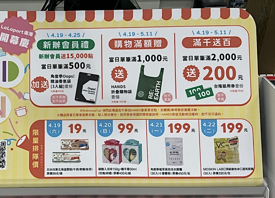 4/19至5/11展開台隆手創館南港大店獨家〈開幕慶〉活動,首四日推出限量商品排隊價優惠,4/19-日本四葉北海道雪糕每支19元(原價99元),4/20-碳酸入浴球+護手霜禮盒99元(原價400元),4/21-角度學植萃高效洗衣膠囊30入/小蒼蘭香199元(原價450元),4/22-MDSKIN LABO頂級維他命C透亮面膜30入199元(原價330元)。