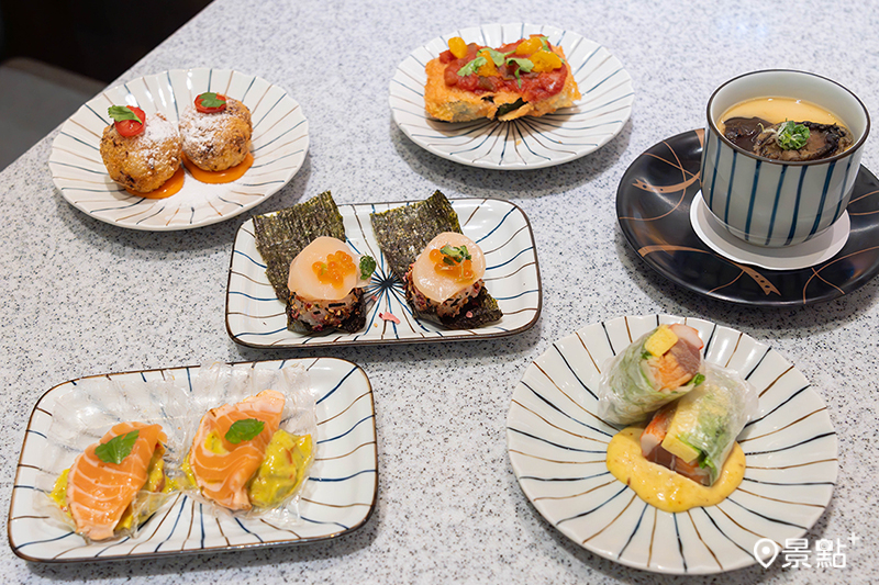 全新菜色研發以繽紛色系展現春日花漾感,推出「蒜蓉鮑魚茶碗蒸」、「爆汁櫛瓜拿破崙」、「嘎嘣脆辣肉球」、「鮮彩干貝壽司」、「鮭魚塔酪梨」、「芥末胡麻海鮮卷」等六款新潮百味壽司,突破大眾對日料的既定印象,帶來「不像壽司的壽司料理」全新體驗。