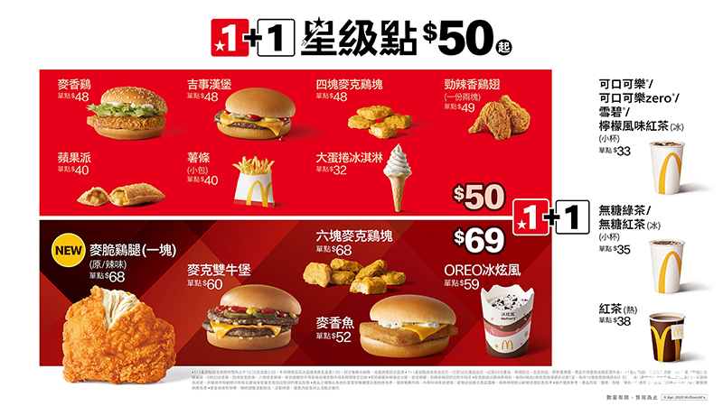 「麥脆雞腿(1塊)(原味/辣味)」正式加入超人氣「1+1星級點」,$69紅區選擇更加多元!
