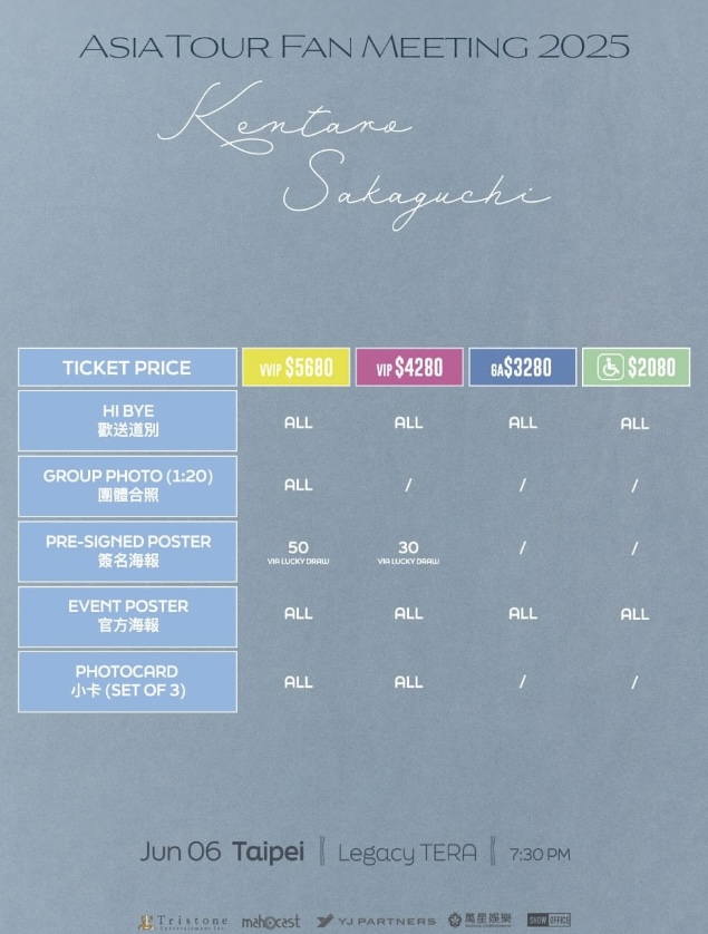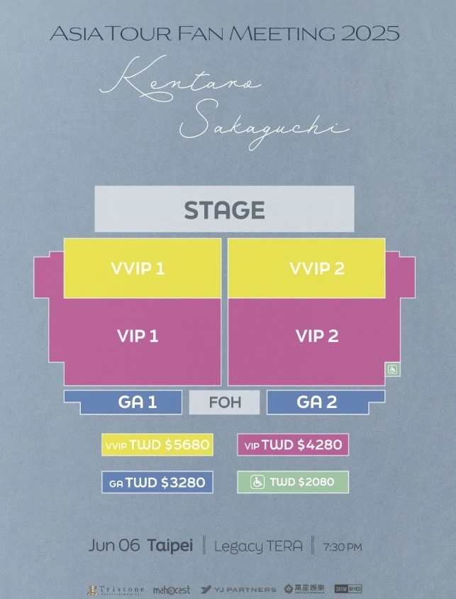 票價則分為VVIP區 $5,680 元、 VIP區 $4,280元、 GA區$3,280元、身心席$2,080。