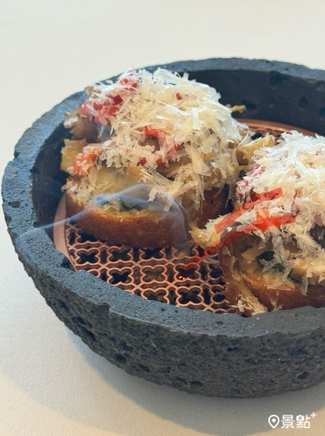 開胃小品由帕馬火腿/大甲芋頭/自製鹹蛋黃、鱒魚子煙燻甜菜根塔、義大利烤餅/燉肉醬/酸奶等小品組成,造型精巧、味富個性,用餐之始即標記出LOPFAIT樂斐的Fine Dining基因。前菜佛羅倫斯燉金錢肚/青醬/法國麵包的靈感來自佛羅倫斯另一道馳名小食-牛肚包,將酥脆麵包、青醬、燉牛肚、甜椒與帕瑪森起司以tapas概念組合放入球形容器煙染燻香,一小口卻滋味飽滿,以手取食、輕鬆怡然。