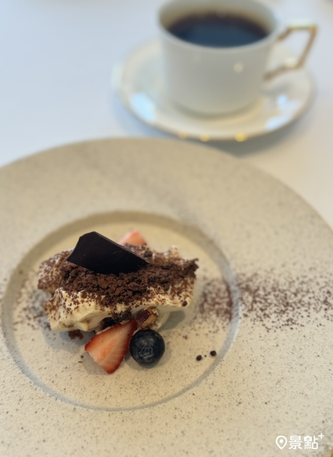 主甜點在桌邊呈現,服務人員依義大利傳統吃法為客人將新鮮的提拉米蘇舀至點心盤,再灑上莓果、堅果、可可粉等自選配料,飽吸濃縮咖啡與甜酒的手指餅乾和香濃馬茲卡邦起司在口中交融,滋味綿密醇厚替用餐畫上美好句點,「客人想吃多少我們就挖多少!」