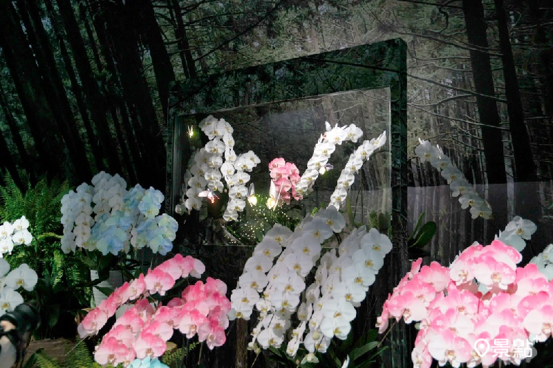 元素有台南聞名國際的蝴蝶蘭,使用錼創科技的MicroLED技術打造近乎裸視3D的成像效果,讓虛擬的蝴蝶飛舞於繽紛的蝴蝶蘭花叢中。