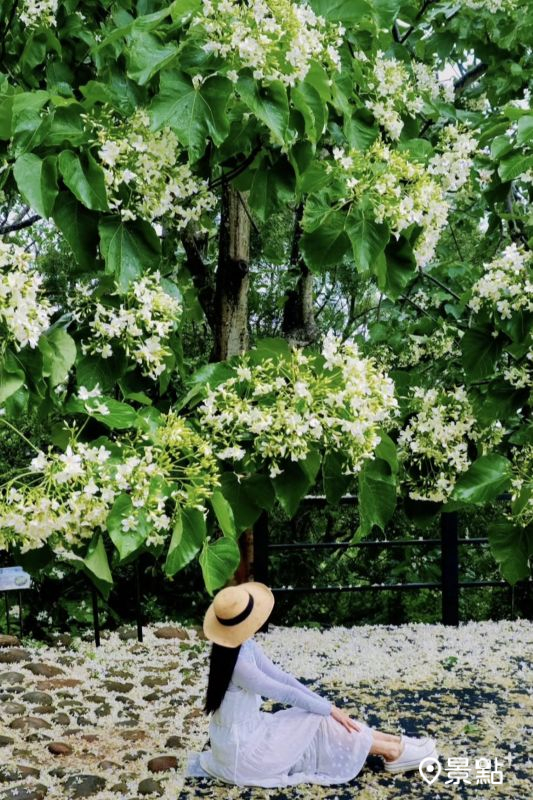 園內熱門取景點位於黑色欄杆處,除了可將樹梢上的花朵及落花地毯一同入鏡,還能以枝葉為前景進行錯位拍攝,拍出花海包圍人像美照,也可以蹲坐在垂落的枝葉下方,捕捉近距離花景,或是搭配園內桌椅,拍出宛如雪景環繞般的唯美畫面。