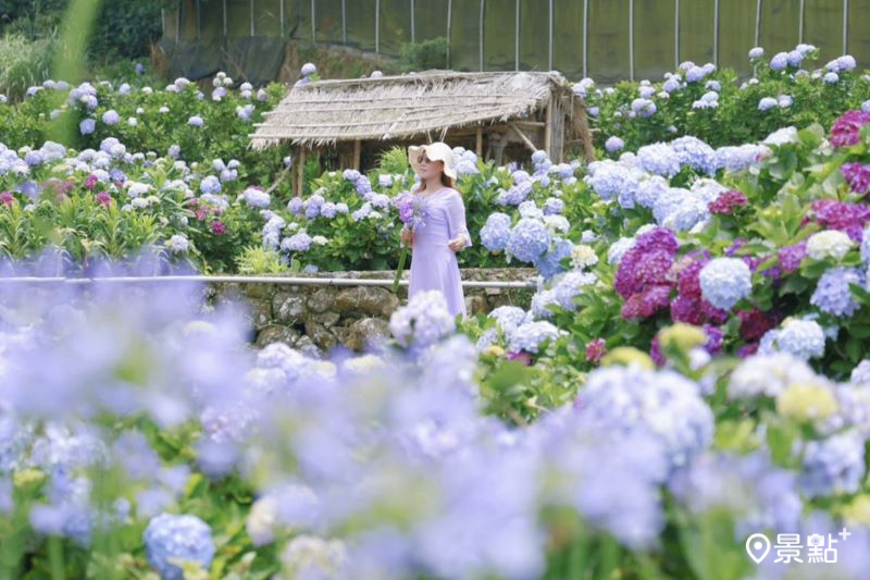 阿華繡球花園最大特色是老闆自己親手搭建的茅草小屋,復古造景融入在夢幻色系的繡球花海中,讓人宛如置身油畫場景,隨手一拍都充滿了浪漫氛圍。