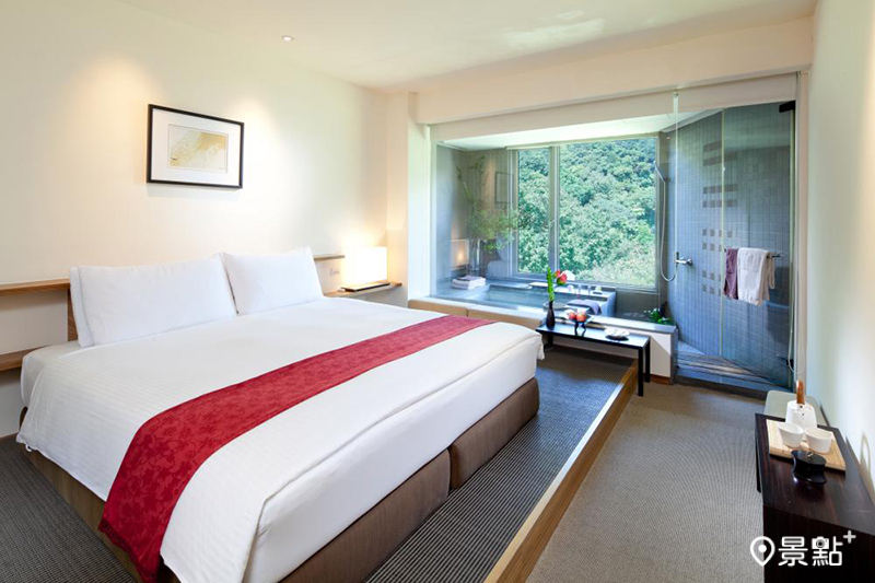 每間客房皆設有寬敞的落地窗,讓陽明山四季的自然景觀成為最迷人的背景畫布。無論是清晨的薄霧、午後的陽光,或夜晚星辰的微光,都能透過窗景映入眼簾,讓人彷彿置身於山林畫境之中。