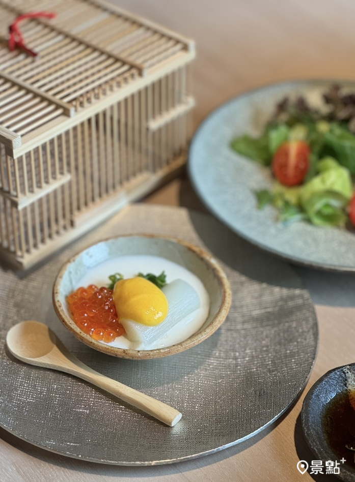 以白蘆筍、鮮奶油等打製成滑嫩慕斯底,柔滑口感入口即化,上層擺放白蘆筍、法式蛋黃醋及鮭魚卵打造不同風味層次,並以台灣本地「過貓」嫩葉作為清新菜葉點綴,清爽細膩的口感喚醒味蕾。