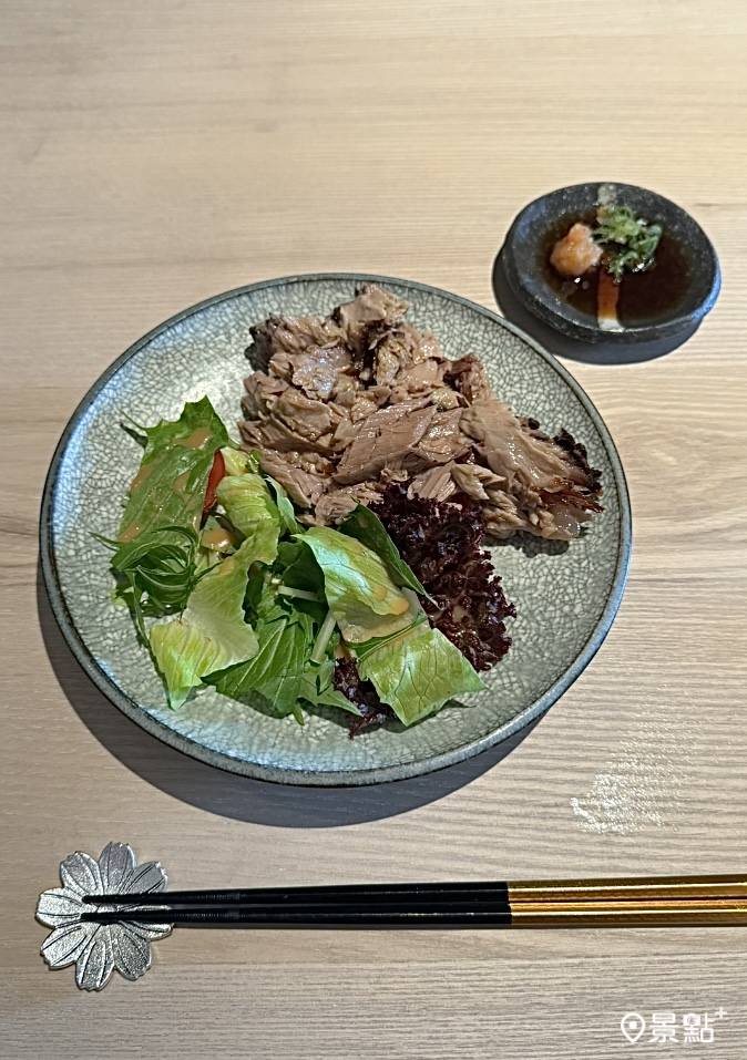 選用鮪魚的魚頭部位,輕抹岩鹽與白胡椒,細火慢烤50分鐘。外層魚皮微焦酥脆,內裡肉質彈嫩多汁,一刀劃下,鮮甜油脂縈繞唇齒。配以手工蘿蔔泥、蔥花自製柚子醋,點綴魚肉的濃郁風味。