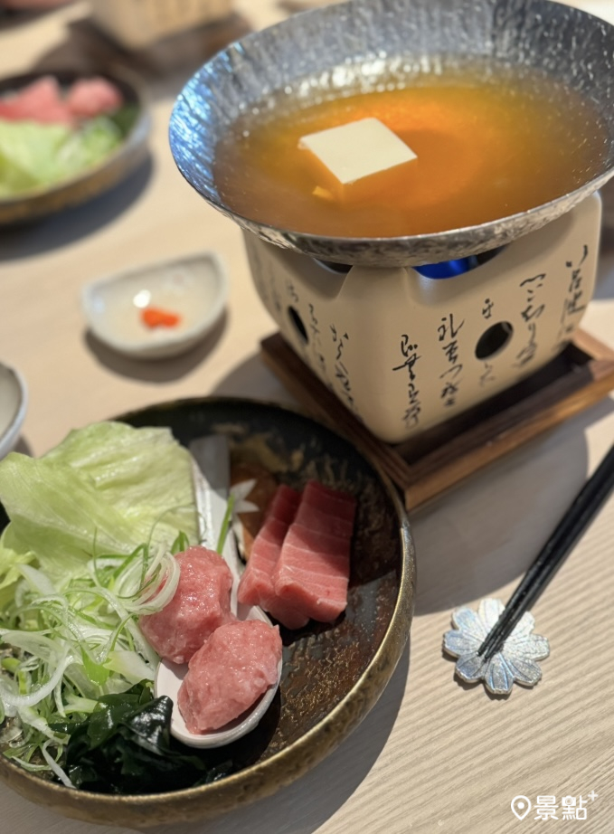 靈感源自江戶「蔥尾鍋」,將鮪魚赤身及中腹製成的魚丸與青蔥入鍋涮煮,湯底由昆布、柴魚片、香菇熬製而成,另附純手工製作的柚子辣椒醬,賓客可依喜好微調辣度,為湯品注入柑橘清香與微辣刺激,在暑熱中帶來溫暖且舒爽的滋味。