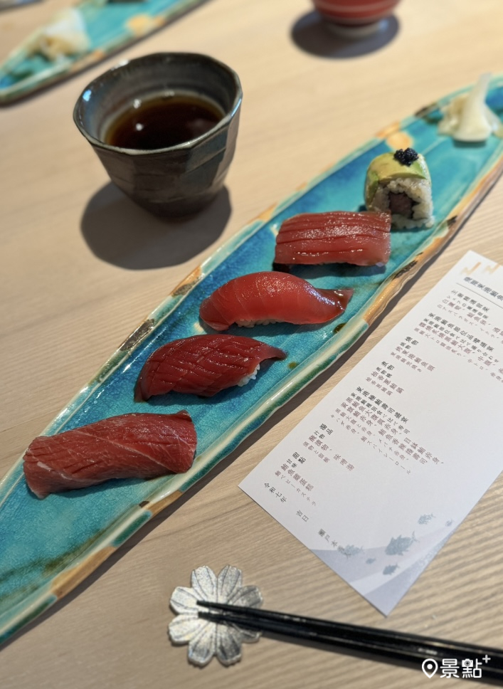 黑鮪魚大腹、黑鮪魚赤身、大目鮪赤身、 黃旗鮪赤身、鮪魚香辣捲壽司 鮪魚香辣捲壽司:將黑鮪魚赤身搗碎後,拌入特製辣味美乃滋,再以新鮮酪梨包裹外層,增添滑順口感與清爽果香,香辣濃郁中仍保留鮪魚的甜味與層次,是五貫壽司中最具刺激的口味變化。