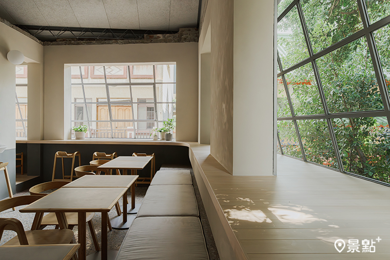 登上二樓,眼前豁然開朗,是開放感十足的咖啡空間。座位區運用大片玻璃門窗模糊內外界線,引入充足光線與自然風,營造出讓人想長時間停留的氛圍。