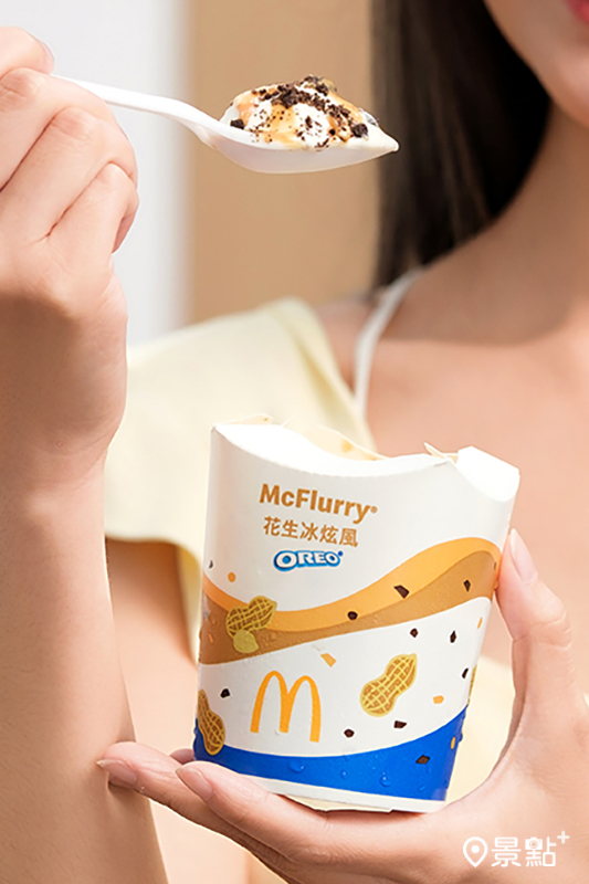 「OREO花生冰炫風」以經典奶香冰淇淋為基底,加入在地台南14號落花生所製成的濃郁花生醬,再撒上OREO巧克力餅乾碎片,濃郁花生香與酥脆口感,鹹甜交織創造夏日新風味。