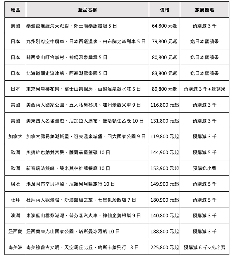 長線則有「埃及阿布辛貝神殿、尼羅河河輪旅行10日」早鳥預購折5,000元,入住尼羅河畔五星費爾蒙酒店1晚,及尼羅河巡航升等五星DELUXE等級河輪。