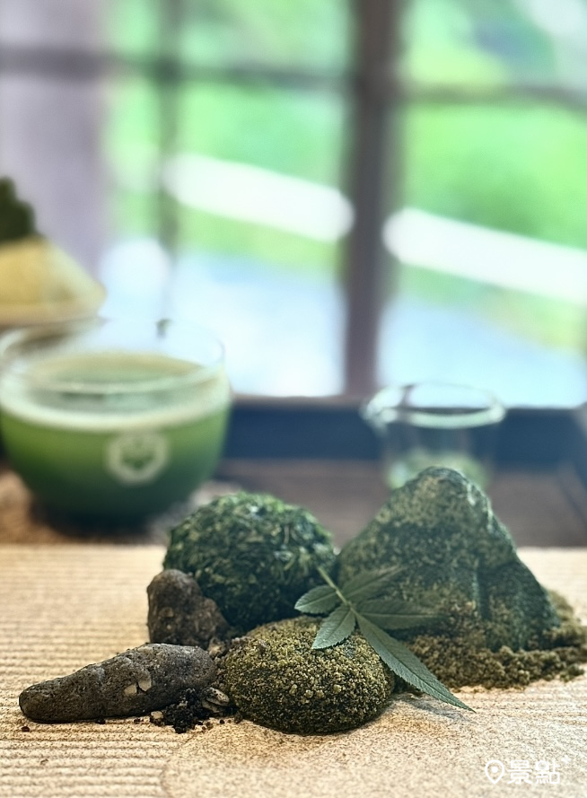 「箱庭 山本屋」以日本庭園中的「枯山水」設計哲學,希望透過簡約古樸的「侘寂」美學角度跨界用甜點轉化成視覺語彙,呼應這寧靜的森林庭園。
