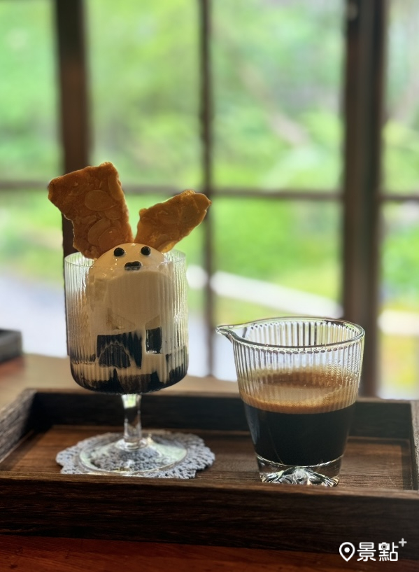 此冰品的最下層鋪有咖啡凍,再放上香草冰淇淋,撒上巧克力豆,淋上espresso後,巧克力豆瞬間產生層次分明的風味變化,呈現摩卡口感。搭配一旁的手工杏仁焦糖餅乾,構成視覺與味覺上的雙重享受。