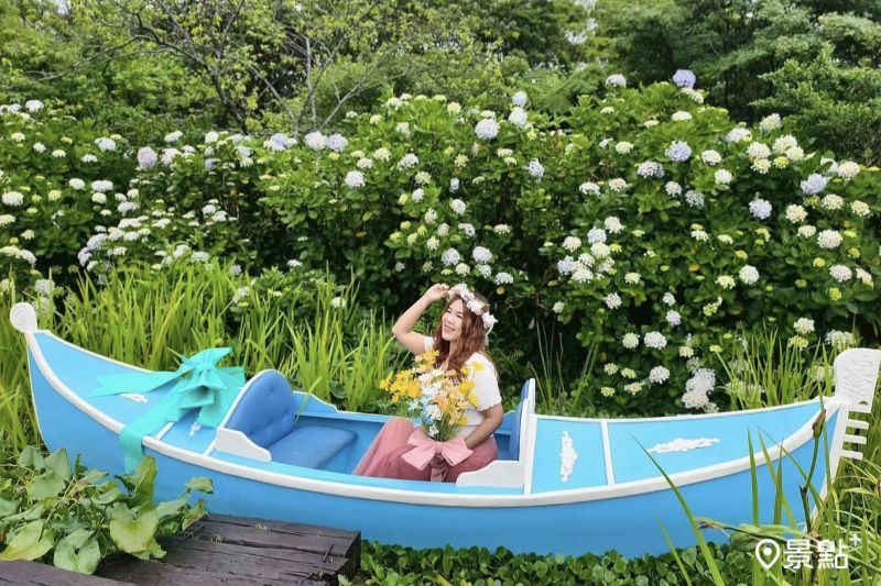 園內設有不少打卡造景,其中最經典的就是池畔的兩艘小船,一艘是充滿古裝劇氛圍的烏篷船,另一艘則是擁有夢幻藍外觀的貢多拉船,小船與繡球花海同框的獨特場景,吸引不少花海控穿著特色服裝前往拍攝。