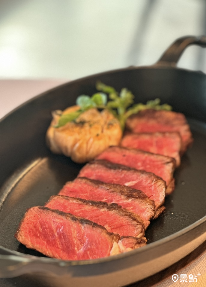 Newport乾式熟成肋眼牛排,油花細緻如大理石紋,咬下瞬間湧出豐郁脂香,迷人的奶油、堅果氣息與柔嫩口感達到完美平衡。而Newport乾式熟成紐約客牛排則紋理緊實、肉味濃郁,焦香外層包藏著帶勁咬感,適合喜愛大口吃肉的饕家。牛排配菜也趨精緻化,例如,傳統的焗整顆馬鈴薯改以千層方式呈現,馬鈴薯片層層堆疊、慢煎定型至表面焦酥,出餐時灑海鹽、金箔提味添色,工整噴香、猶似金磚,切面層理盡顯廚意匠心。