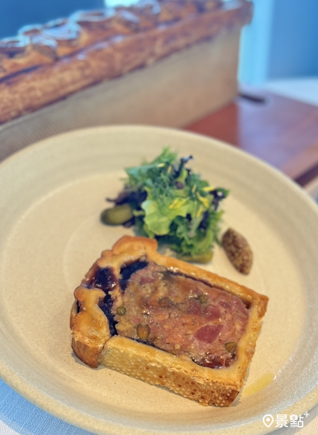 乍聞肉派,以為是純血法式料理,但經過教父牛排廚師團隊巧手轉譯,變身一道從用西餐語彙重塑的台灣味。T55麵粉混合奶油製成派皮,填入豬絞肉、油封雞胗、雞肝醬、開心果、綜合香料與國人熟悉的瓜仔(脆瓜)焗烤、靜置,再從封口處注入波特酒醬汁待其凝固,前後歷時4天方能完成,扎實、香濃的肉派搭著脆如餅乾的派皮入口,愈嚼愈香,「瓜仔肉派」因產量有限、售完即止。