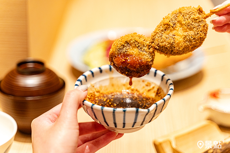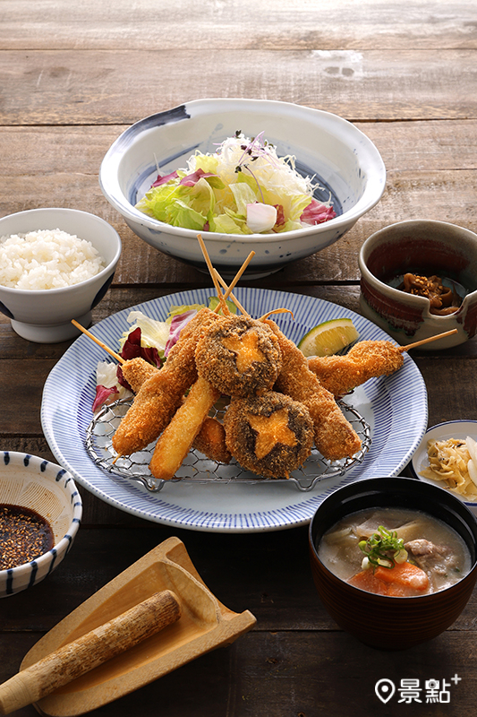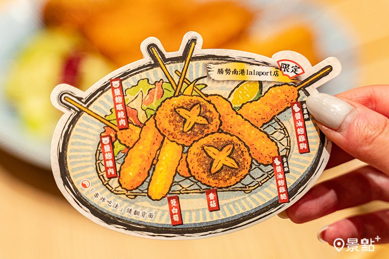 南港Lalaport店獨家限定料理「六揚勝串炸套餐(490元)」,一次品嚐6種精選串炸,包含香菇、筊白筍、雪巖雞帶皮胸肉、雪巖雞淨腿肉,以及究好豬眼鏡肉和腰內肉串炸料理。