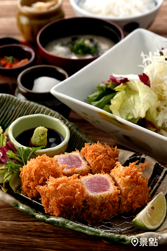 「伊勢路–勝勢日式豬排」以蔥鹽與薑汁醬燒展現鮪魚鮮美風味。「蔥鹽鮪魚套餐540元」嚴選台灣東港黃鰭鮪魚,將鮪魚裹粉後酥炸至約2~3分熟,以麵衣封鎖住鮪魚的鮮味與軟嫩,搭配蔥鹽品嚐更能提升新鮮鮪魚的豐富層次和食趣。