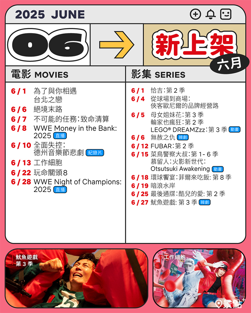 除了《魷魚遊戲》重磅回歸,6月還有多部話題新作與強檔續集一同登場,包括:紀錄俠客歐尼爾商業傳奇的《從球場到商場:俠客歐尼爾的品牌經營路》、爆笑家庭喜劇《輪家也瘋狂:第2季》與《母女姐妹花:第3季》,以及《無赦之仇》、《絕境末路》、《暗浪水岸》、《動物謎案:第5章》與揭開真相的《失落泰坦:鐵達尼觀光潛水器遇難揭秘》。