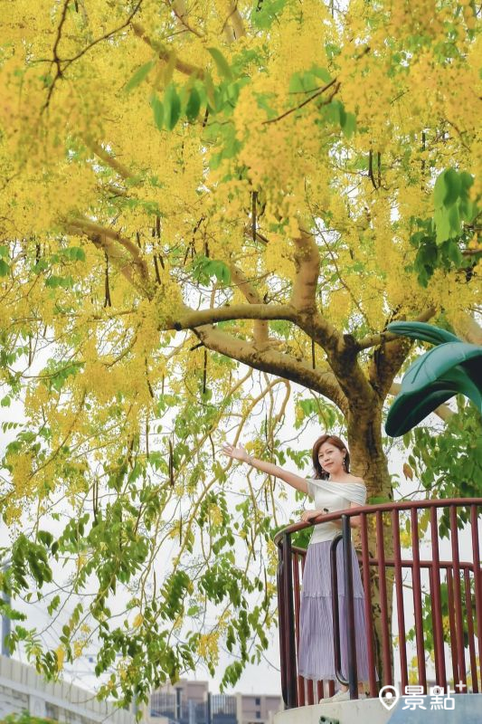 位在台中樂成宮旱溪媽祖廟附近的旱溪媽祖公園,有一株盛開且茂密的阿勃勒花海,搭配公園內磨石子溜滑梯,可近距離拍到滿版黃金雨花海美照。