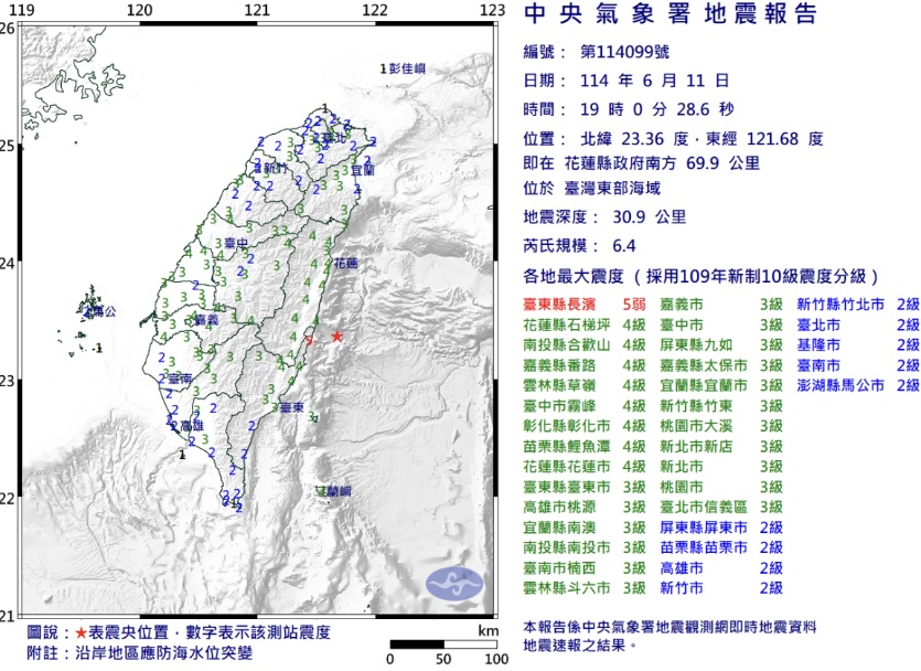 6月11日週三晚間19時手機國家級警報大響,讓不少人嚇了一跳,這次地震震央在花蓮縣政府南方 69.9 公里 ,位於臺灣東部海域,地震深度30.9公里屬於淺層地震,地震芮氏規模6.4,各地最大震度達5,中央氣象署提醒沿岸地區應防海水位突變。
