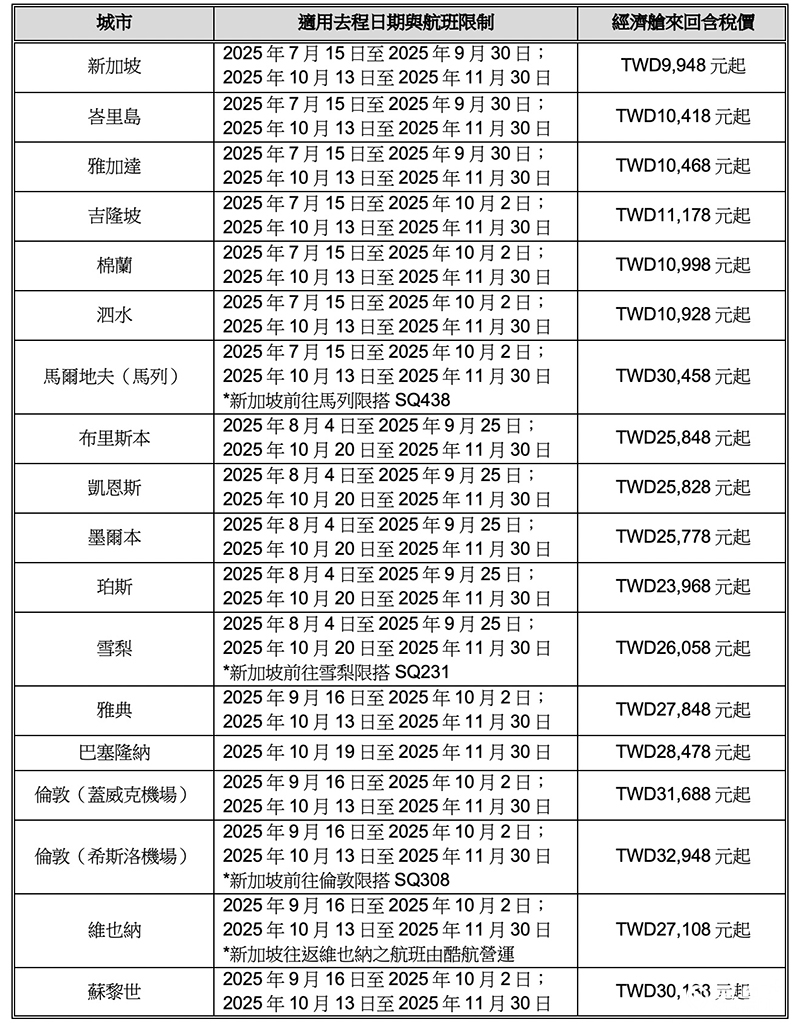 為豐富旅遊行程,即日起至2025年12月31日,新航旅客以訂位代號在 Pelago 預訂旅遊體驗可享九折優惠,最高可折新幣150元。KrisFlyer 會員消費每新幣1元可獲得KrisFlyer哩程3哩。