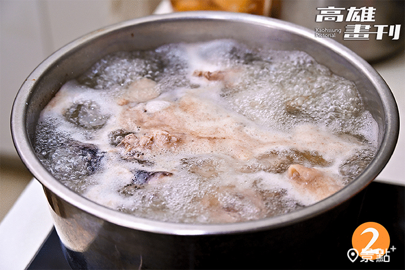 2、雞肉與薑片放入鍋中,加冷水蓋過食材,加熱至大滾後熄火。