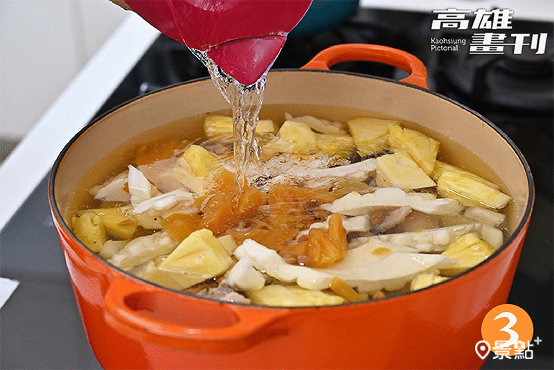 3、將汆燙過的雞肉放入湯鍋,加入苦瓜、蔭鳳梨豆醬、新鮮鳳梨,注水至淹過食材。