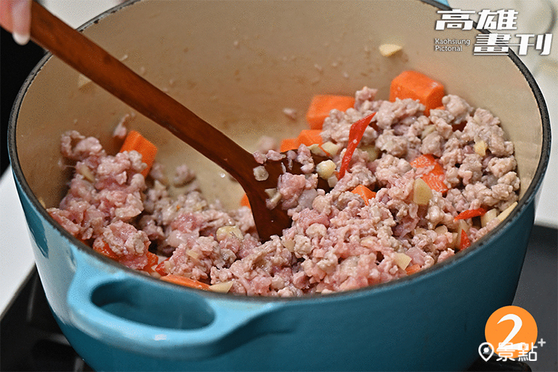 2、加入紅蘿蔔與豬絞肉,炒至七分熟。