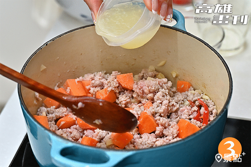 · 冷油下爆香料的作法,可避免油溫過高導致蒜頭焦黑,香氣也能更均勻釋放,炒香時間相對縮短。