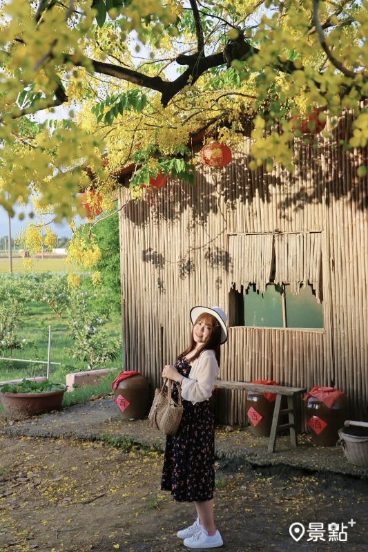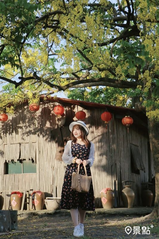 竹管厝周圍擺有陶甕、扁擔、燈籠等古早味物品,取景時可將阿勃勒花海作為前景一同入鏡,黃昏時段還能捕捉光影撒在房屋上的氛圍感美照,一旁也有石頭桌椅可以搭配拍攝,是一處充滿古早氣息的阿勃勒賞花點。