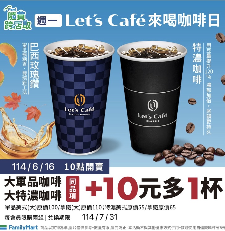 週一也要享用咖啡優惠,全家便利商店的大杯單品咖啡、大杯特濃美式咖啡都有第二杯10元的優惠,單品拿鐵與特濃拿鐵也同步有優惠,可使用隨買跨店取購入,可以寄杯,優惠只有一天快把握!