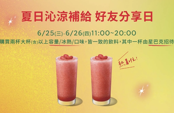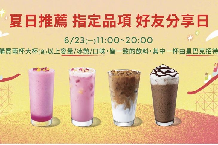活動期間 11:00-20:00 購買兩杯大杯(含)以上容量/冰熱/口味皆一致的指定品項飲料,其中一杯由星巴克招待。每人每次至多買二送二,飲料限當場一次領取。