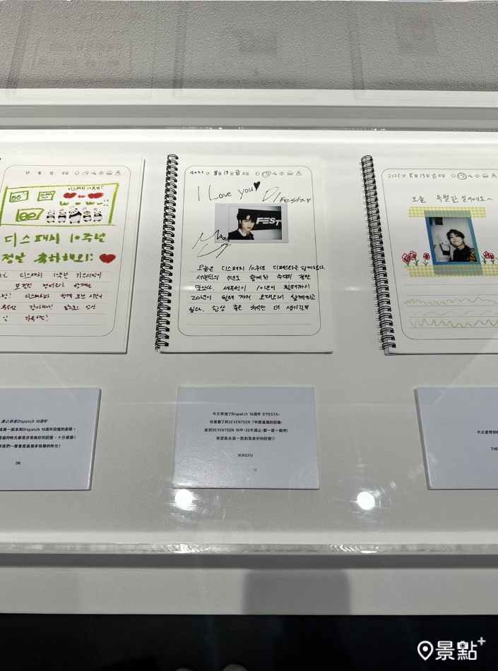 展出近300幅Dispatch專屬拍攝畫報,橫跨十年記錄63位偶像的成長旅程。除了大型寫真、特寫、幕後花絮外,還能看到初心親筆手寫日記、繪畫與留言牆等珍貴私密創作。透過LED鏡面構築的時光隧道裝置,粉絲可穿梭於回憶與現實間,重溫入坑路上的每一份悸動。