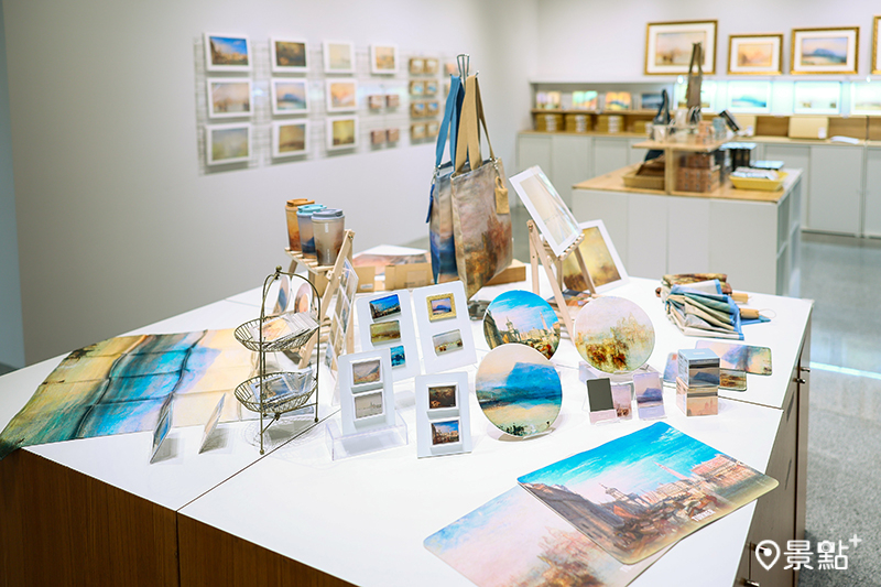 以《藍色瑞吉山之日出》、《威尼斯—安康聖母聖殿》、《洛桑:日落》等經典畫作為靈感,推出吊飾帆布袋組、保溫杯、絕美證件套/絲巾/明信片等,還有最受大家歡迎的複製畫,更特別的是與本土品牌黑沃咖啡合作,推出四款獨特風味的咖啡濾掛禮盒,每款口味包裝都搭配不同透納代表作,更是收藏或贈禮的好選擇。