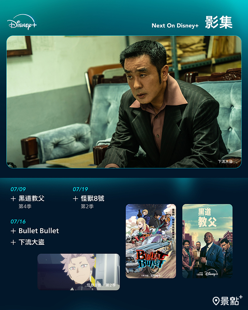 此外,《變形金剛》系列電影也將一次上線,無論你是忠實鐵粉還是初次接觸這個宇宙,現在就是重溫博派與狂派間的史詩對決、以及認識經典角色的最佳時機。Disney+今日更驚喜宣布爛番茄100%神級動畫《膽大黨》第二季將於7月4日精彩上線,首季也將於7月2日一次推出!此外《咒術迴戰》導演朴性厚的原創末日後新作《BULLET/BULLET》也即將登場,務必鎖定Disney+掌握豐富影視作品。